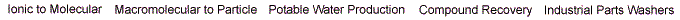 Products by application Reverse Osmosis, Ultrafiltration and Ultraviolet Filtration Equipment Small, mid and large production standard models for Reverse Osmosis and Nanofiltration Custom sized Filtration Units Ultra-Violet water purification. Ultra-Filtration, Microfiltration Equipment Pressure filtration systems. Industrial housing filters. Water Production and Purification Equipment Mobile Potable Water Production Units Ultra-pure Water Production Units (Laboratory use) Compound Recovery and Concentration Equipment Compound separation, concentration and recovery equipment Glycol / Lutron closed-loop recovery and re-use equipment. Industrial Part Washers Automotive Part Washers Industrial Part Washers © Ecochem International Inc. 2009